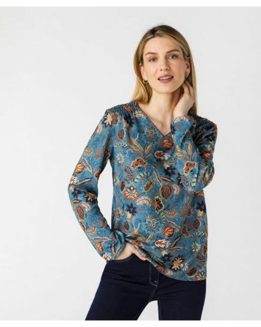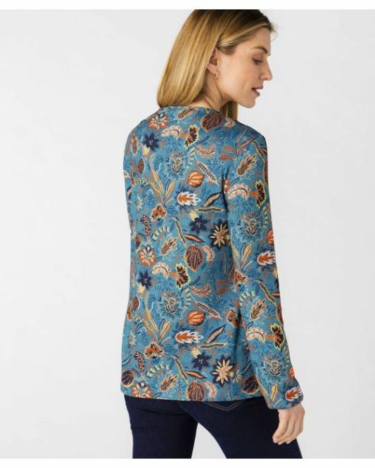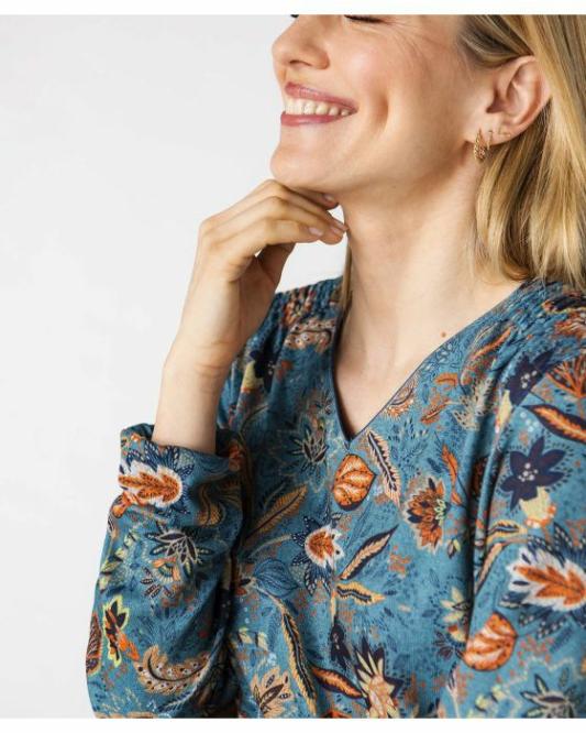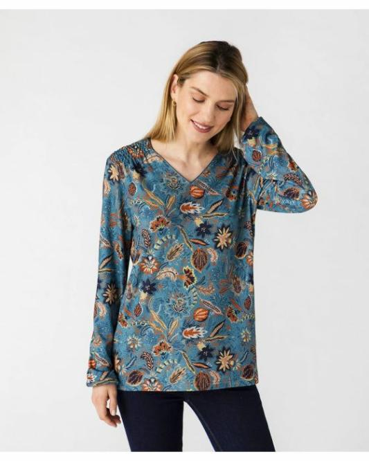 Femme Damart Tee-Shirts | Tee-Shirt Maille Chaude À Smocks Turquoise/gris Imp. Fleurs